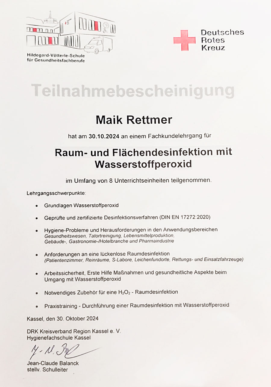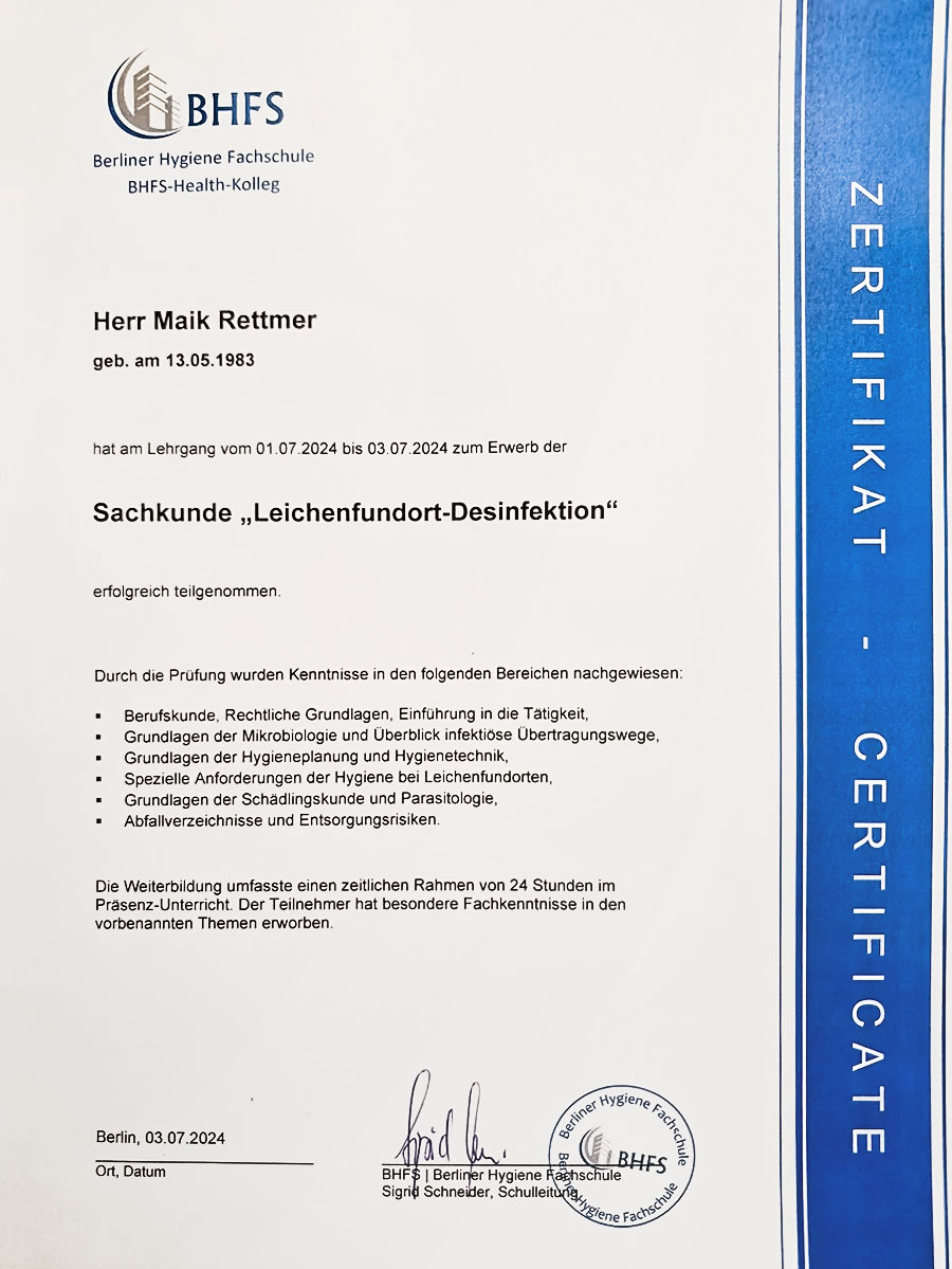 Im Februar 2024 bereitete ich mich durch eine Vorgründungsqualifizierung im IGZ Wernigerode auf meine Selbstständigkeit vor. Weitere wichtige Schritte waren ein dreitägiger Sachkundelehrgang für Leichenfundort-Desinfektion an der Berliner Hygiene Fachschule im Juni und ein Fachkundelehrgang für Raum- und Flächendesinfektion mit Wasserstoffperoxid in Kassel im Oktober. Diese Fortbildungen gaben mir das Wissen und die Sicherheit, um in diesem außergewöhnlichen Beruf Fuß zu fassen.